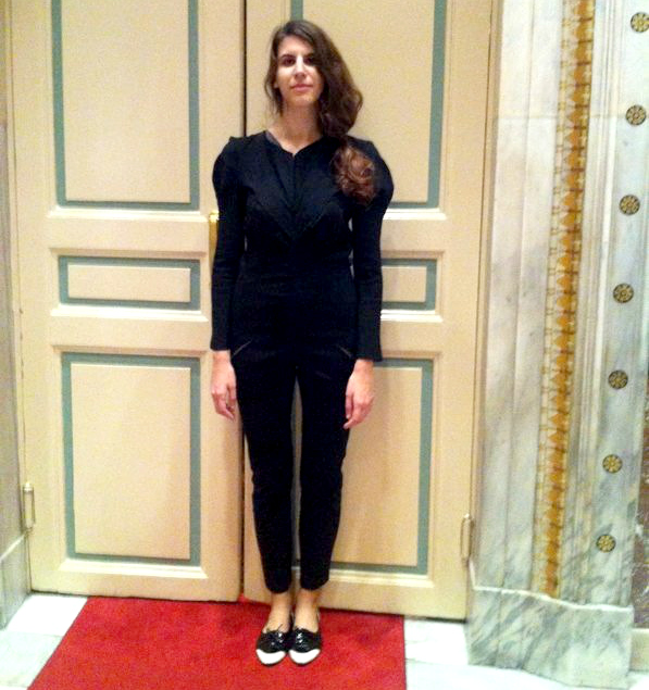 Με αυτό το σώμα μπορεί κανείς να φορέσει τα πάντα. Σκέφτομαι πώς θα ήμουν με ολόσωμη φόρμα πάνω από τον αστράγαλο και πάνινες ελβιέλλες (πλεονασμός βέβαια, πάντα πάνινες είναι οι ελβιέλλες) και με διαπερνά σύγκρυο – βέβαια, μπορεί και να μην το έχω συνηθίσει, δεν λέω. Όπως και να έχει, η τριλογία πουκάμισο-παντελόνι-σακάκι σε μονόχρωμο μαύρο θα είναι πάντα επίκαιρη, και το φλατ παπουτσάκι συνδυασμένο με σχεδόν τα πάντα, το τιμούν και στο Παρίσι, τα είπα και εδώ. Η Στέλλα φωτογραφήθηκε στο πολιτιστικό κέντρο Παρνασσός.