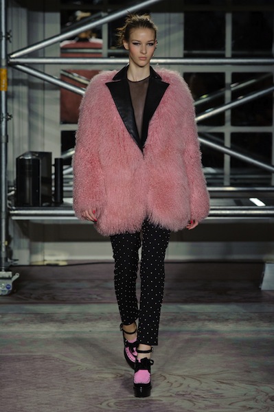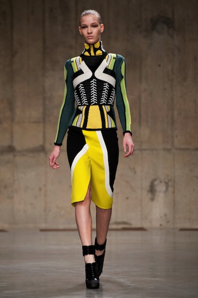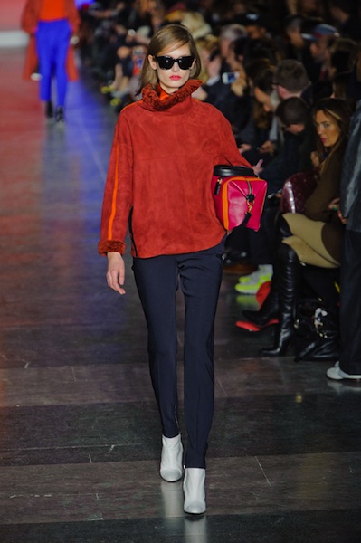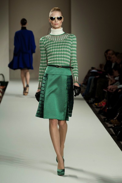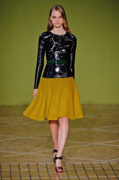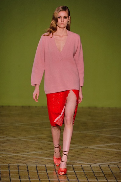 Να και κάτι πιο σέξι, από αυτά που είναι πιο σπάνια (έτσι το έχω στο μυαλό μου, είπαμε) στην Αλβιόνα, η θηλυκότητα που επέβαλε αποφασιστικά ο Jonathan Saunders και τα τολμηρά χρώματα – έβαλα και μια μαύρη διαφάνεια για να πάει καλά εβδομάδα, αλλά η καρδιά μου χτυπάει στη νοητή γραμμή που ενώνει το λάστιχο του ροζ πουλόβερ με την παγέτα της κόκκινης φούστας.