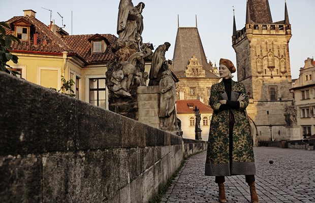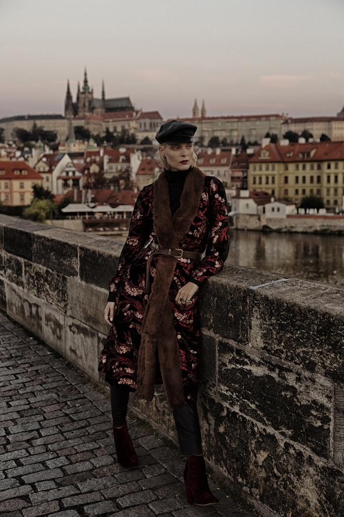 Το αριστοκρατικό vintage, τα περίτεχνα κεντήματα , οι δαντέλες, τα βελούδα, τα μπροκάρ, οι παγέτες και η (οικολογική) γούνα, που πάντα χρησιμοποιούσε η Τόνια στις συλλογές της, αυτή τη φορά απογειώνονται οπτικά ενταγμένα τέλεια μέσα σε ένα περιβάλλον που μοιάζει φυσικό τους. Είναι σαν μπατζάκια και μανίκια, οι άκρες δηλαδή, να είναι η προέκταση της Πράγας – ακόμα και τα χρώματα και τα μοτίβα είναι αντιστοιχισμένα προσεκτικά με σκηνικό που “τους μοιάζει” και την κατάλληλη ώρα, με το κατάλληλο φως, για maximum effect.