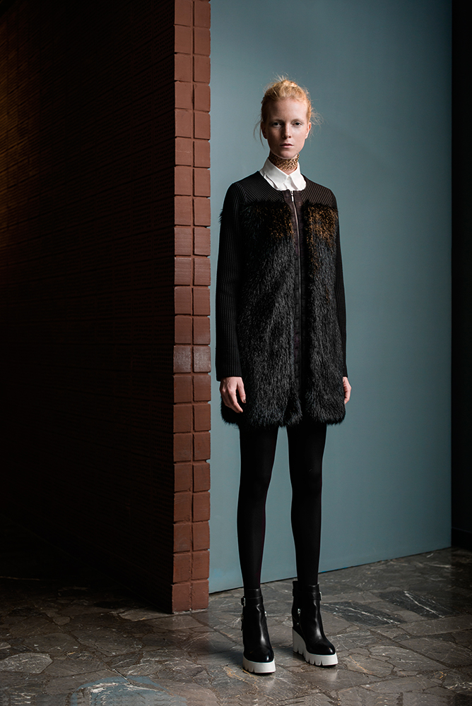 Φέτος τον χειμώνα, τα μόνα χρώματα που ανέχεται ο Στέλιος να διακόψουν το ασπρόμαυρο φέτος είναι το μπορντό και το μπλε ρουά (δηλαδή δύο χρώματα από αυτά που μπορώ να ανεχτώ και εγώ, ευτυχής σύμπτωση) και τα αξιοποιεί στα φορέματα και τις φούστες, δηλαδή στα πιο θηλυκά του κομμάτια. Τα φορέματα και γενικά τα “ολόσωμα” σχέδια τα έχει σχεδιάσει με προτεραιότητα τις γραμμές του σώματος και το πώς να τις τυλίξει αναδεικνύοντάς τις όσο πιο πολύ γίνεται, με λιτό design και μια δυο τσαχπινιές, ενώ τα σύνολα στα οποία πρώτο λόγο έχουν οι συνδυασμοί τα φαντάστηκε προφανώς πιο προσανατολισμένα στη δημιουργική μόδα, με μεγαλύτερη έμφαση στους συνδυασμούς και τους σχεδιαστικούς πειραματισμούς και επιρροές ανδρόγυνου. Το styling των Χάρη Γκοτζαμανίδη και Ηλία Μιχαλόλια είναι ιδεώδες, και οι αναφορές του μακιγιάζ και των μαλλιών στη βλοσυρή Cate Blanchett ως βασίλισσα Ελισάβετ με ξετρέλαναν (τόσο που ελπίζω να μην κάνω λάθος, ΝΑ ΤΟ ΗΘΕΛΕ ΚΑΙ Ο ΙΔΙΟΣ). Δέρμα και γούνα, μάλλινο και μετάξι, λείες υφάνσεις, καπιτονέ και πλέξεις, όλα έχουν έναν ρόλο στη συλλογή που έτσι γίνεται αυτομάτως δύο ισάξιων (και το ίδιο κομψών) ταχυτήτων.