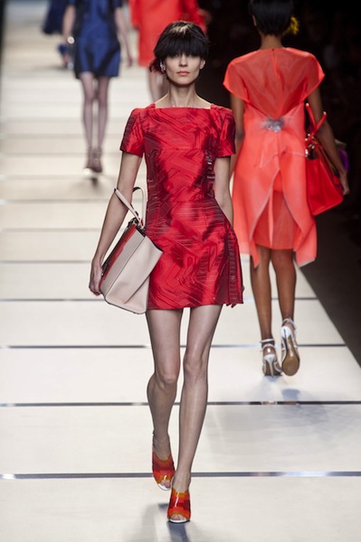 Ο οίκος Fendi τόλμησε το digital print και σε αυτό το κόκκινο φόρεμα το πέτυχε διάνα (το πεθύμησα το πιο διακριτικό digital print μετά το μικρό overdose του Λονδίνου), τόλμησε το μεταλιζέ ύφασμα και το πέτυχε διάνα (δεν θα τη σετάριζα με γυαλιστερή σιφόν μπλούζα, αλλά η μπλε φούστα είναι θεσπέσια), τόλμησε την άκαμπτη γραμμή “τουλίπα” και την πέτυχε διάνα. Η όλη συλλογή δεν με έριξε και στα γόνατα, αυτά τα κομμάτια όμως με έκαναν να στο σκεφτώ.