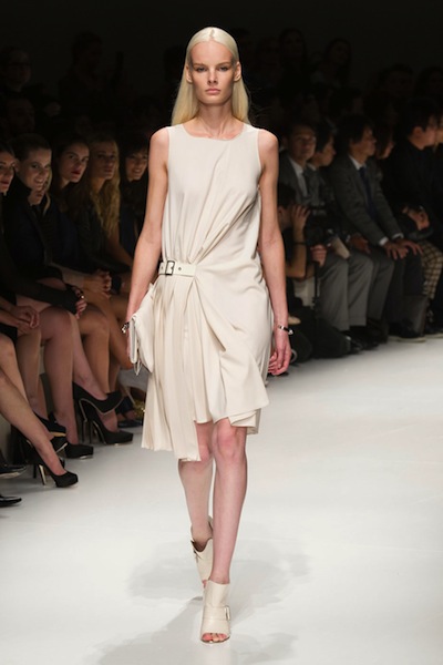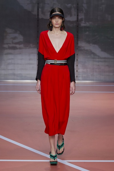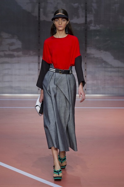 Crop tops και από τον Ferragamo, αλλά το σήμα κατατεθέν της συλλογής είναι οι φούστες που αποτελούνται από στρώσεις ριγμένες με τέτοιον τρόπο η μια πάνω στην άλλη ώστε να σχηματίζουν πτυχώσεις και ντραπαρίσματα. Οι πλαϊνές σουρίτσες που δημιουργούν αγκράφες και ζωνάκια κάνουν αυτή τη συλλογή την πιο moda urbana, την πιο μιλανέζικη από όλες. Παλέτα αποκλειστικά γης, για να μην τραβάει ζέστη, αρκετή υγρασία (μαθαίνω πως) έχει το Μιλάνο.